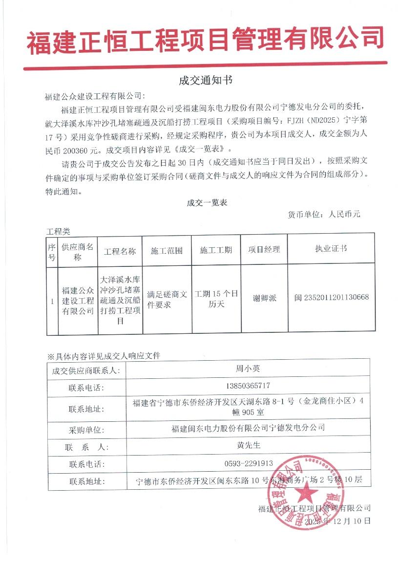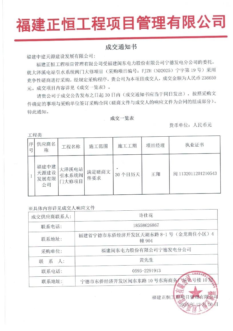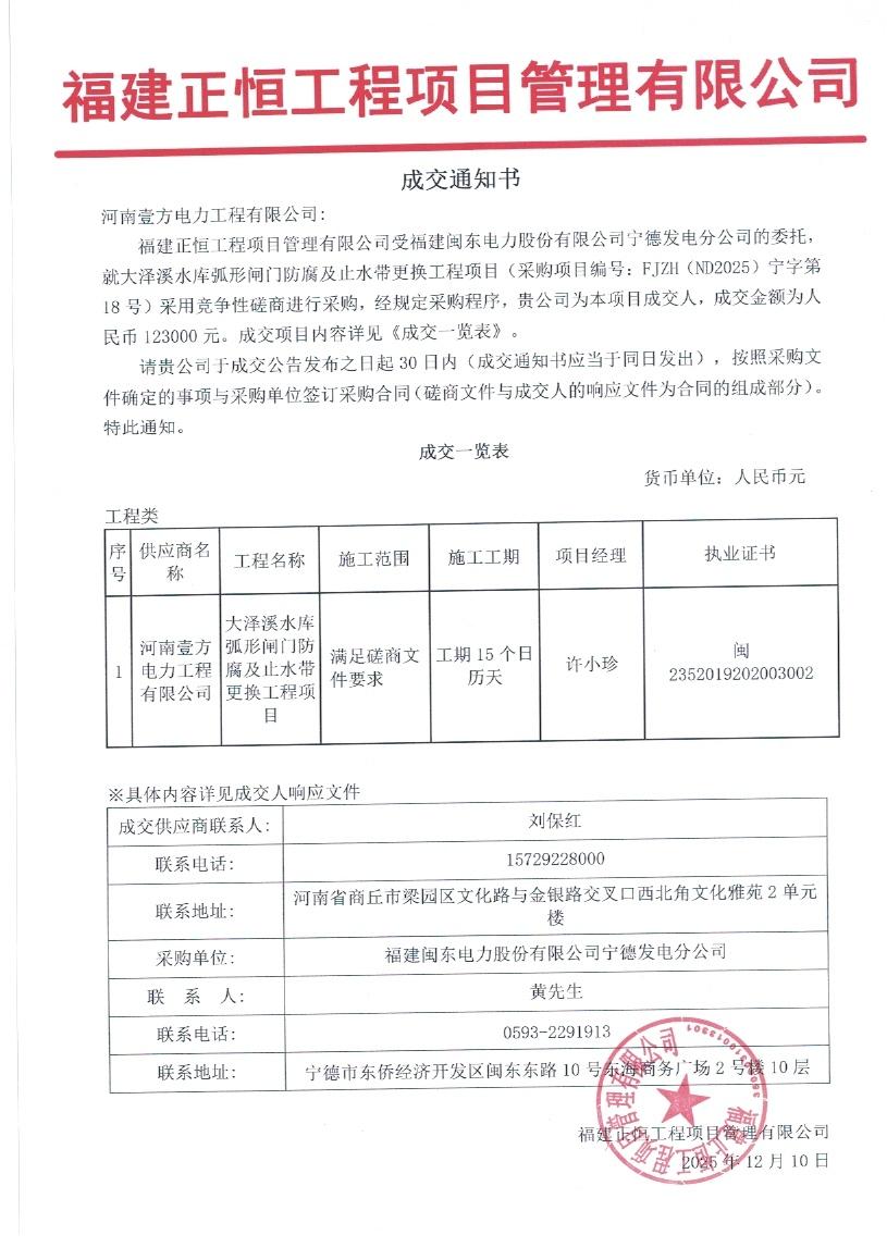 大澤溪電站引水系統(tǒng)閥門大修等項(xiàng)目成交通知書